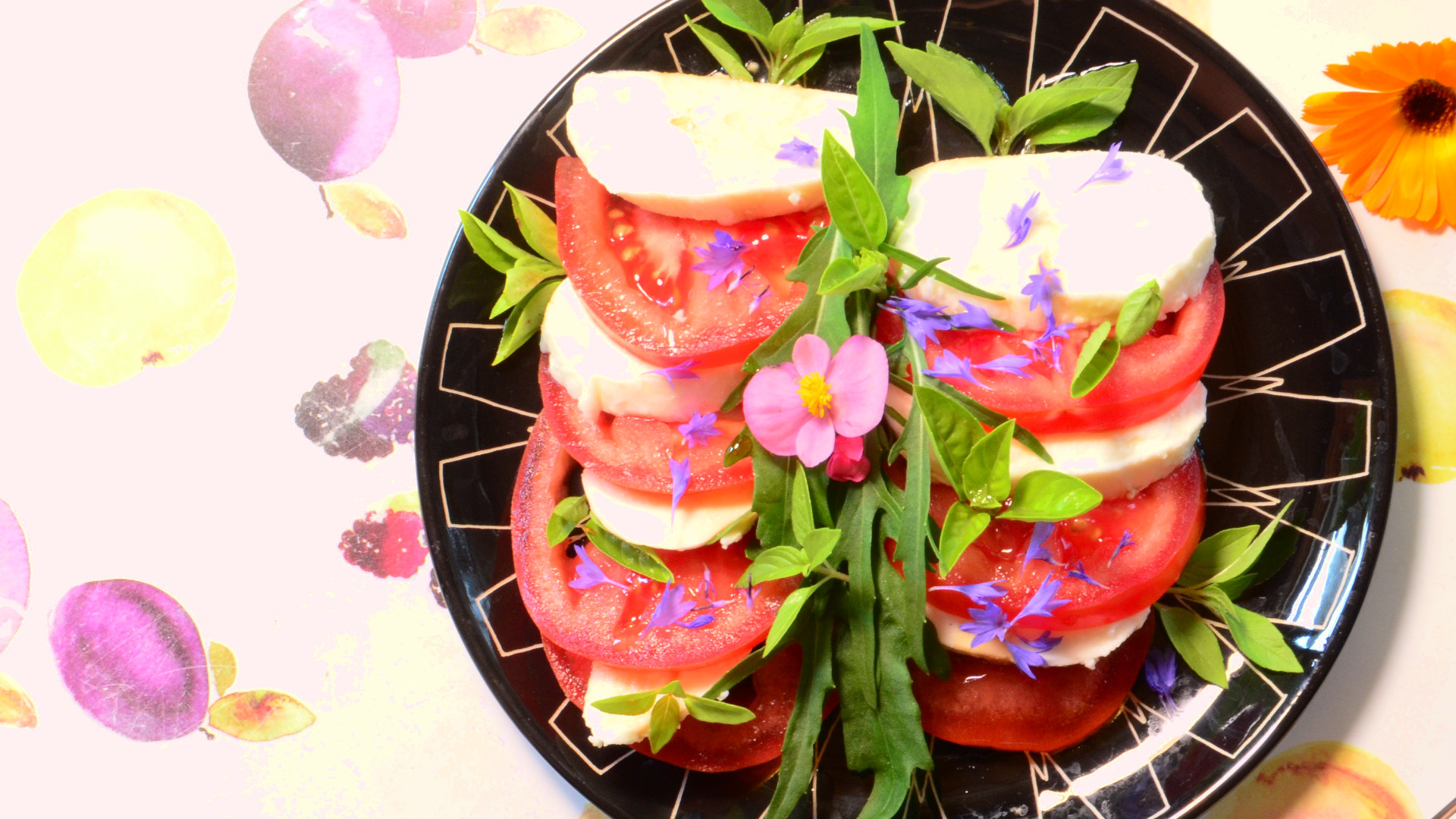 Büffel Mozarella Tomate, Basilikum, Ruccola, Olivenöl, Balsamico, Orangensaft, Pfeffer in der Buffet Variante ab 10 Personen